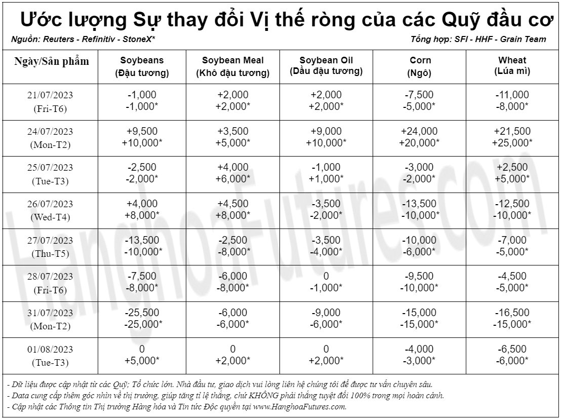 - Kết thúc ngày giao dịch thứ Ba 01/08/2023, các Quỹ đầu cơ Hàng Hóa trên thị trường Nông sản (CBOT) đã tiếp tục tăng vị thế Bán ròng trong ngày đối với 02 mặt hàng: Ngô và Lúa mì.