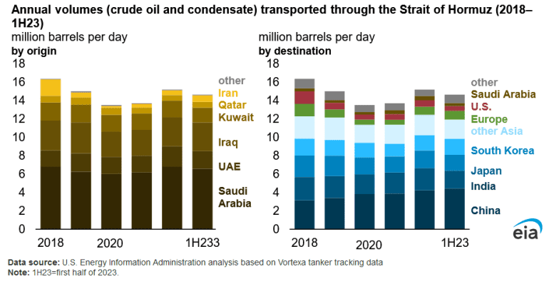 Theo Cơ quan Thông tin Năng lượng, tuyến đường biển giữa Vịnh Ba Tư và Vịnh Ô-man là điểm vận chuyển dầu quan trọng nhất thế giới . Trong nửa đầu năm 2023, lưu lượng dầu của nước này đạt trung bình 21 triệu thùng mỗi ngày, chiếm khoảng 21% lượng tiêu thụ dầu mỏ-chất lỏng toàn cầu.