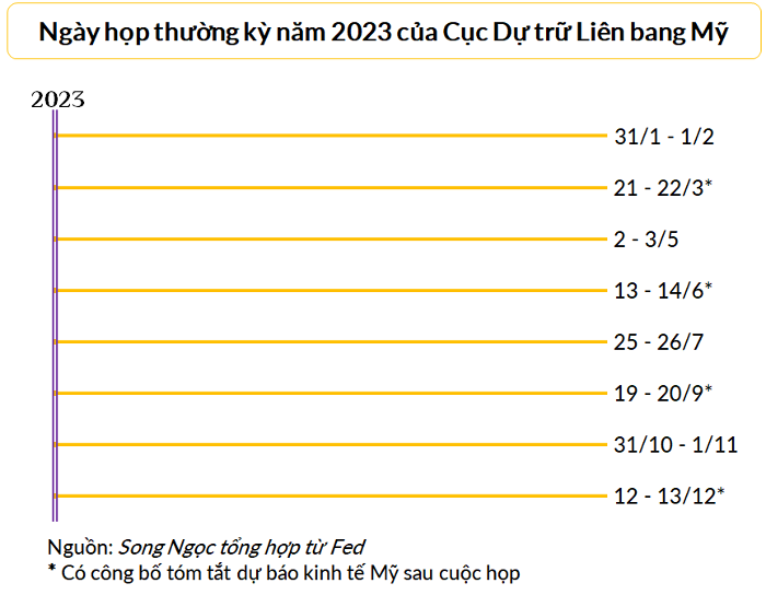 Cuộc họp tiếp theo dự kiến được tổ chức vào ngày 21 – 22/3 và cuộc họp cuối cùng trong năm 2023 diễn ra vào ngày 12 – 13/12. Trong các cuộc họp diễn ra vào tháng 3, 6, 9 và 12 hàng năm, quan chức Fed không chỉ quyết định chính sách lãi suất và cung tiền mà còn công bố thêm dự báo tăng trưởng GDP, tỷ lệ thất nghiệp, lạm phát, ….