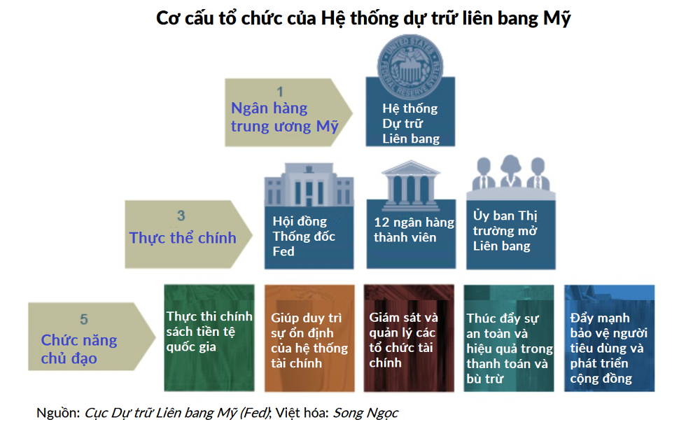 Fed có 12 ngân hàng thành viên ở các khu vực khác nhau của nước Mỹ, đồng thời có một Hội đồng thống đốc gồm 7 thành viên.