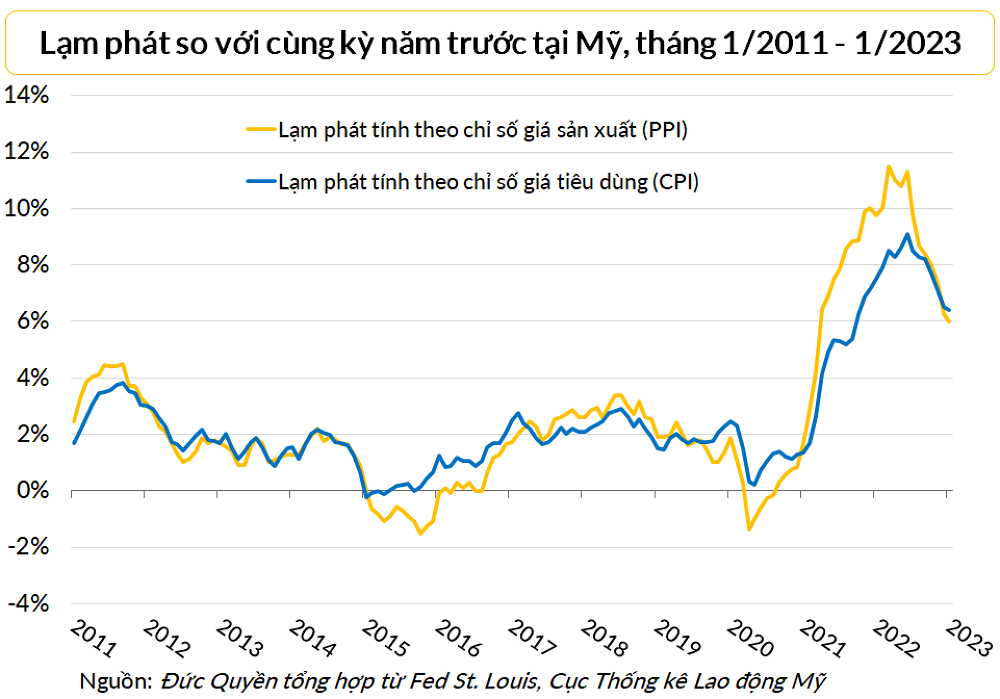 Tháng 1 vừa qua, chỉ số giá tiêu dùng (CPI) và chỉ số giá sản xuất (PPI) của Mỹ tăng lần lượt 6,4% và 6% so với cùng kỳ 2022, đều cao hơn dự báo của các nhà kinh tế và gấp ba lần mức mục tiêu 2% của Fed.