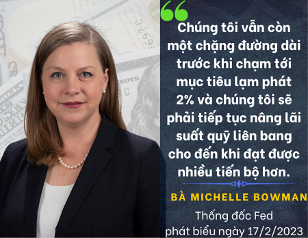 Bà Michelle Bowman, một trong 7 thành viên Hội đồng thống đốc của Fed, nói ngày 17/2: “Tôi nghĩ chúng tôi vẫn còn một chặng đường dài trước khi chạm tới mục tiêu lạm phát 2% và chúng tôi sẽ phải tiếp tục nâng lãi suất quỹ liên bang cho đến khi đạt được nhiều tiến bộ hơn”.