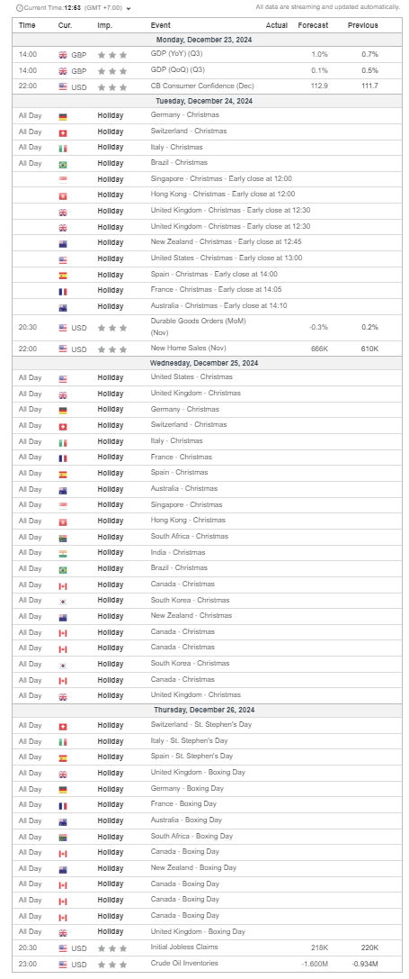 Từ Thứ Ba, ngày 24/12/2024 đến Thứ Năm, ngày 26/12/2024: Thị trường nghỉ giao dịch Lễ Giáng Sinh (Christmas) và Tặng Quà (Boxing Day). Cụ thể: