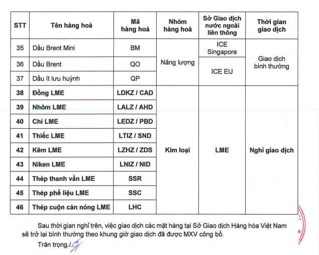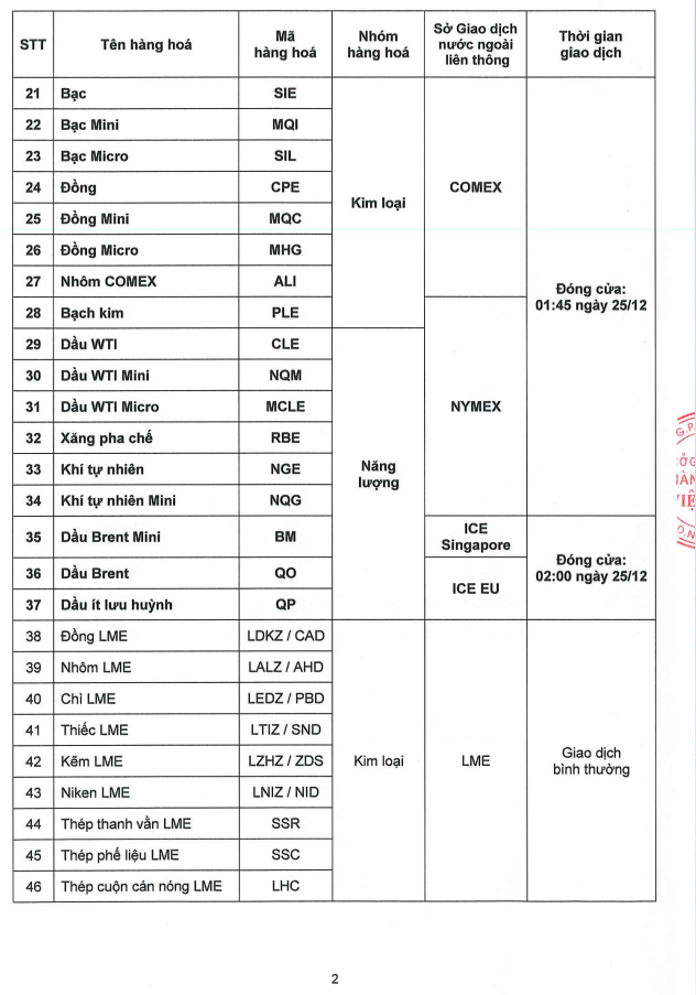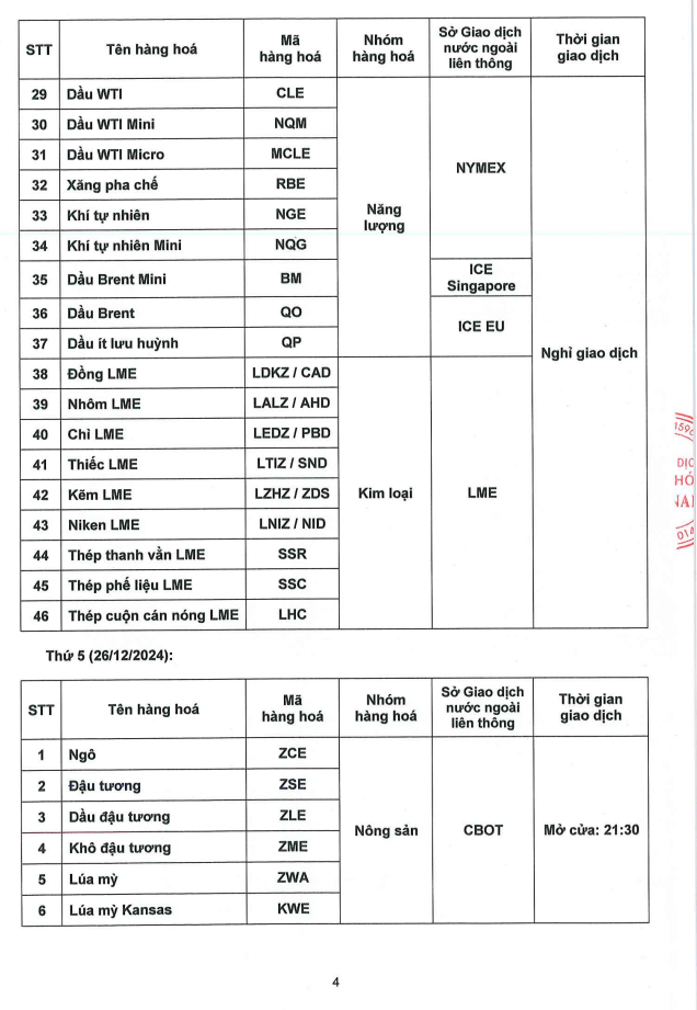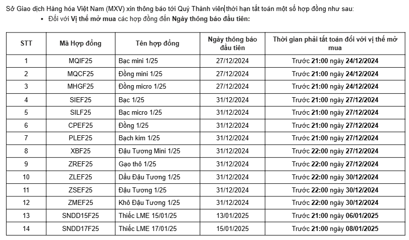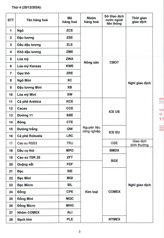 -Thị trường Nguyên Liệu Công Nghiệp (Cà phê Robusta, Đường Trắng....) liên thông ICE - EU: Đóng cửa lúc 19h23 (GMT+7) Thứ Ba ngày 24/12/2024. Sau đó, Nghỉ giao dịch suốt quá trình Lễ và mở bình thường vào ngày Thứ Sáu ngày 27/12/2024.