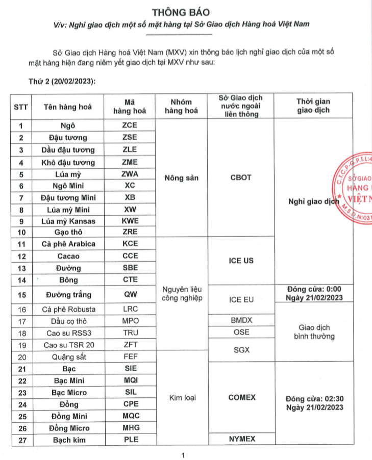 + Thị trường Nông sản và Nguyên liệu công nghiệp nghỉ giao dịch.