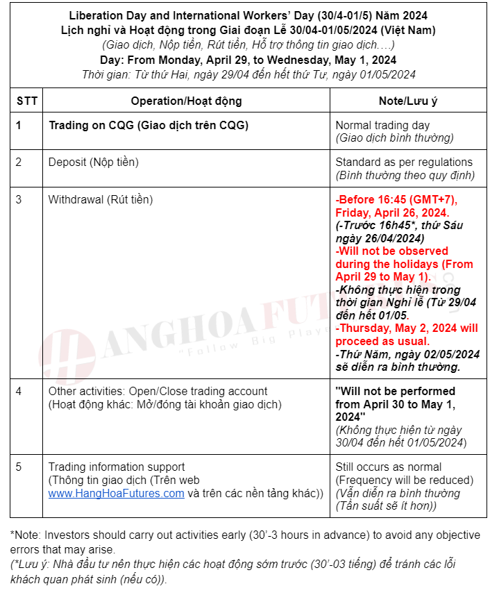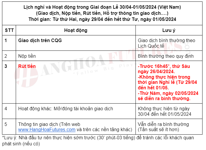 3. Hoạt động khác: Mở/đóng tài khoản giao dịch hàng hóa không thực hiện trong thời gian từ ngày 30/04/2024 đến hết ngày 01/05/2024.
