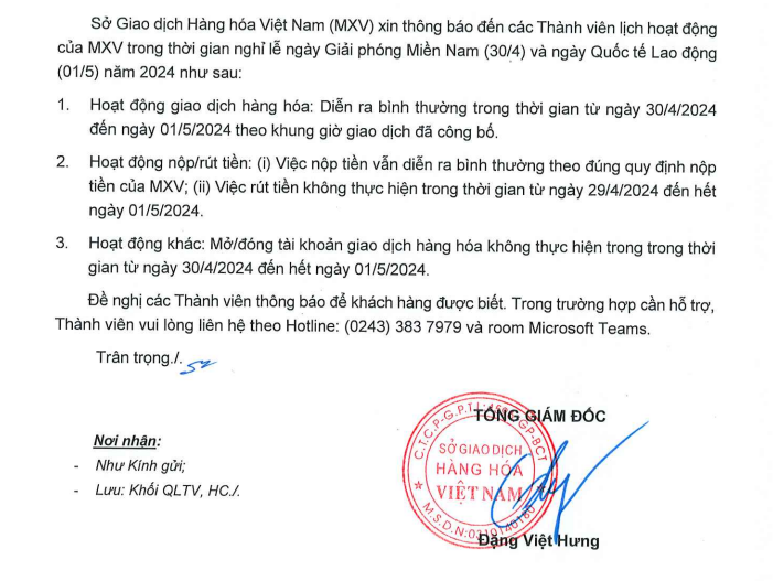 Căn cứ Thông báo số 324/TB/TV-MXV về việc Nghỉ lễ ngày Giải phóng Miền Nam (30.4) và ngày Quốc tế Lao động (01.5) tại Sở Giao dịch Hàng hóa Việt Nam.