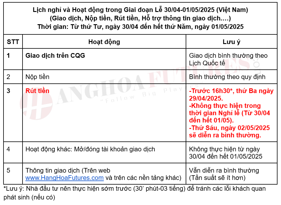 - Hoạt động khác: Mở/đóng tài khoản giao dịch hàng hóa không thực hiện trong thời gian từ ngày 30/04/2025 đến hết ngày 01/05/2025.