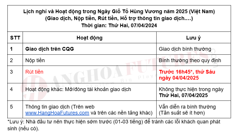 Công ty Cổ phần Saigon Futures (SFI) và Hàng Hóa Futures (HHF) thông báo đến Quý Khách hàng lịch hoạt động trong thời gian nghỉ lễ Giỗ Tổ Hùng Vương năm 2025 như sau: