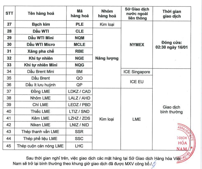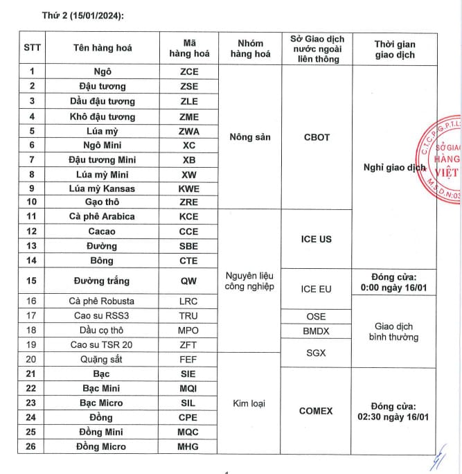 Căn cứ theo thông báo số 55/TB/GD-MXV ngày 10/01/2024 của Sở Giao dịch Hàng hóa Việt Nam về lịch nghỉ giao dịch một số mặt hàng tại Sở vào thứ 2 ngày 15/01/2024, cụ thể như sau: