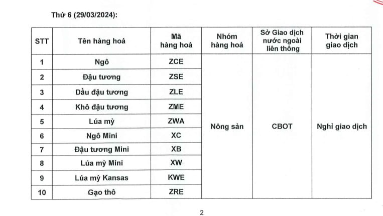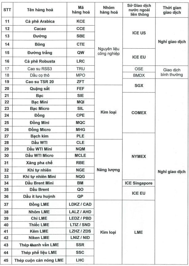 Lịch nghỉ giao dịch một số mặt hằng tại Sở giao dịch Hàng hóa Việt Nam liên thông với Sở nước ngoài