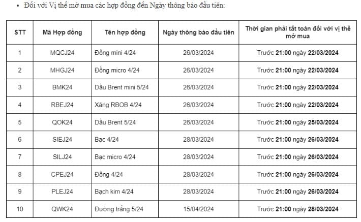 Đối với Vị thế mở MUA các hợp đồng đến Ngày thông báo đầu tiên