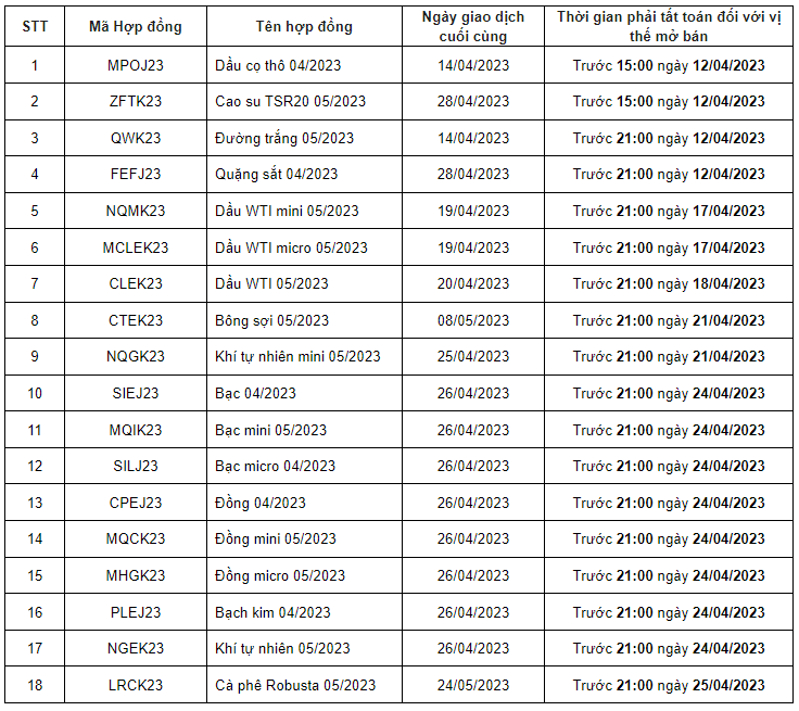 - Sản phẩm Cà phê Robusta (LRC) và Đường trắng (QW) nghỉ giao dịch trong ngày 10/04/2023.