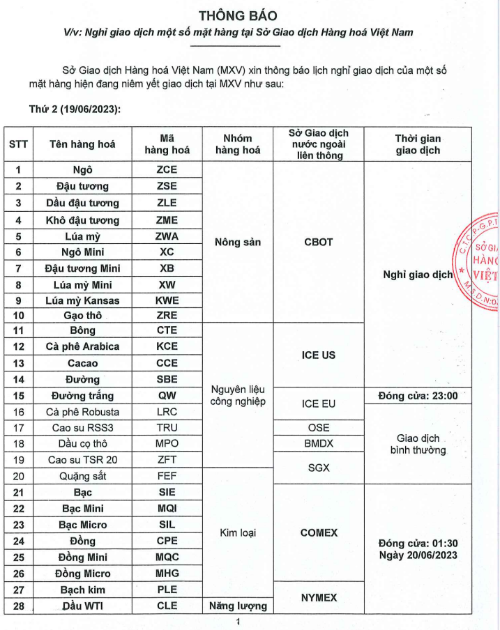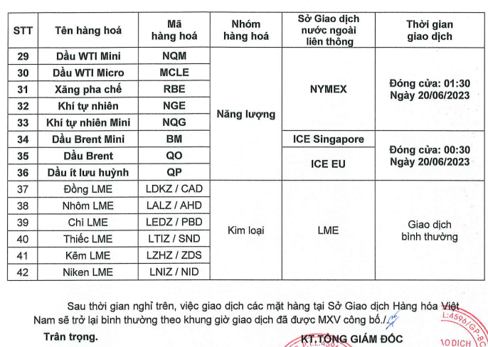 + Năng lượng - Sàn NYMEX (WTI, Xăng, Khí...): Đóng cửa 01:30 sáng thứ Ba ngày 20/06/2023.