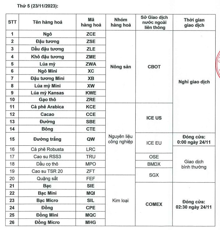 + Nông Sản - Sàn CBOT : Mở cửa trễ 21h30 : Đóng cửa 01:05, GMT+7, sáng thứ Bảy ngày 25/11/2023.