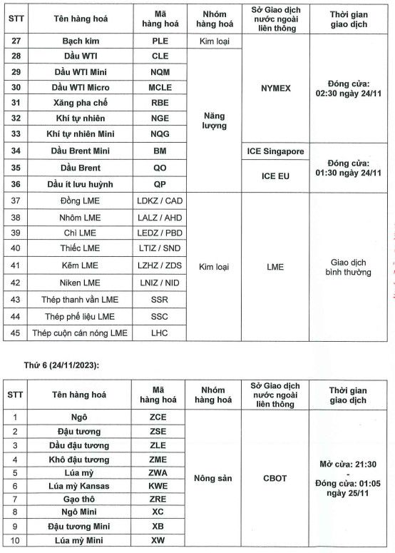 + Kim loại - Sàn COMEX (Bạc, Đồng, Bạch Kim...): Đóng cửa 01:45, GMT+7, sáng thứ Bảy ngày 25/11/2023.