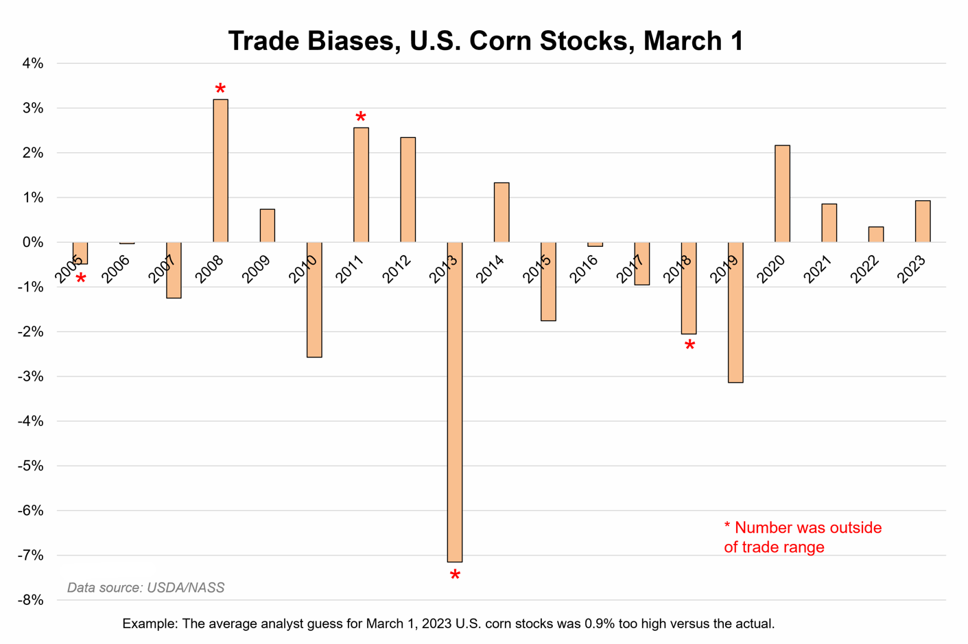 Các nhà phân tích đã có chuỗi bốn năm liên tiếp đánh giá cao tồn kho ngô ngày 1 tháng 3, với kết quả tiêu cực cuối cùng vào năm 2019. Đó cũng là lần cuối cùng hợp đồng tương lai ngô CBOT chứng kiến sự sụt giảm mạnh mẽ trong ngày báo cáo này, dẫn đến mức thấp mới của hợp đồng.