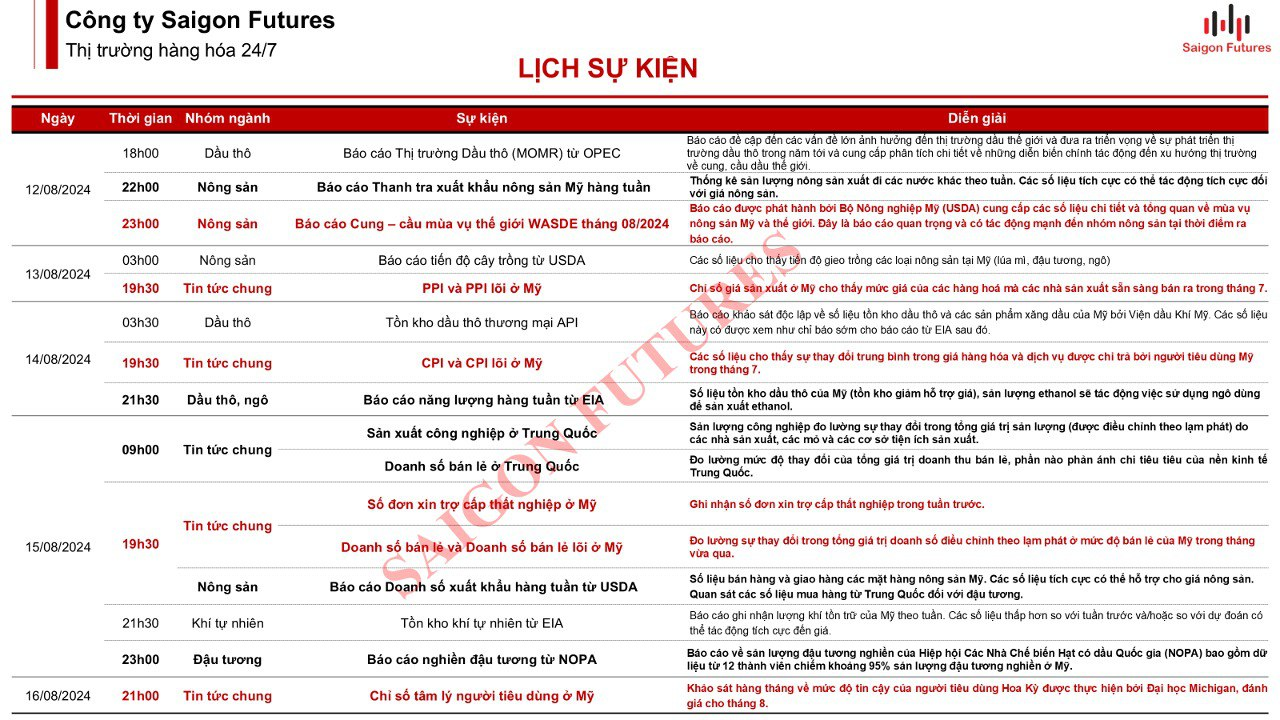 -Lúc, 23h00 (GMT+7) tối nay, thứ Hai ngày 12/08/2024 , thị trường Nông sản (CBOT) sẽ tin tức về Báo cáo Cung - cầu mùa vụ thế giới WASDE tháng 07/2024 từ USDA.