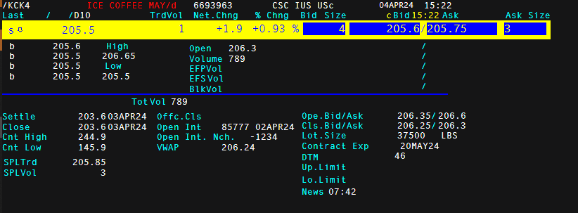 • KCK4 (Cà phê New York): Ký hiệu, hiện là Cà phê Arabica tháng 05/2024 (KCEK24)