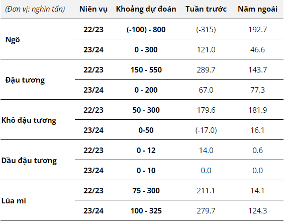 Hãng tin Reuters vừa đưa ra dự đoán trước Báo cáo Xuất khẩu (Export Sales) hàng tuần của Bộ Nông nghiệp Mỹ (USDA) sẽ phát hành vào lúc 19:30 tối nay. Khoảng dự đoán về số liệu bán hàng ròng (Net Sales) niên vụ 2022/23 và 2023/24 của các mặt hàng quan trọng trong tuần từ 28/04 - 04/05 như sau:
