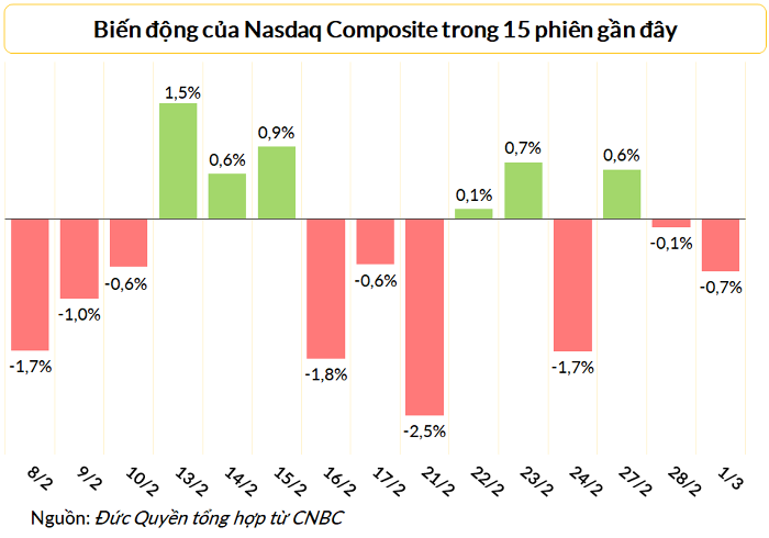 Các chỉ số S&P 500 và Nasdaq Composite của thị trường chứng khoán Mỹ ngày 1/3 diễn biến tiêu cực khi lợi suất trái phiếu Kho bạc tiếp tục lên cao. Nhà đầu tư lo ngại Fed có thể sẽ nâng lãi suất mạnh hơn dự kiến trong cuộc họp sắp tới.