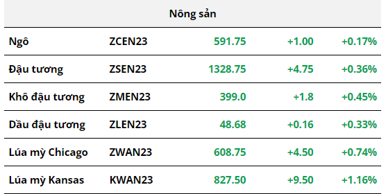 Bắt đầu phiên giao dịch cuối tuần, các mặt hàng nhóm nông sản đang phủ kín sắc xanh. Giá lúa mì và ngô đang được hỗ trợ trong bối cảnh lo ngại nguồn cung từ Ukraine. Cụ thể, Bộ ngoại giao Nga cho biết nếu các yêu cầu cải thiện xuất khẩu ngũ cốc và phân bón của nước này không được đáp ứng, Nga sẽ không gia hạn thỏa thuận biển Đen sau ngày 17/07.