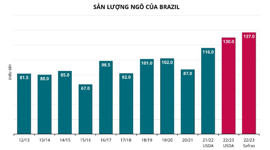 Công ty tư vấn Safras&Mercado dự báo tổng sản lượng ngô niên vụ 22/23 của Brazil sẽ đạt mức kỷ lục 137 triệu tấn, cao hơn đáng kể so với mức 130,289 triệu tấn ước tính hồi tháng 03 của cơ quan này và mức 120,23 triệu tấn của niên vụ trước.