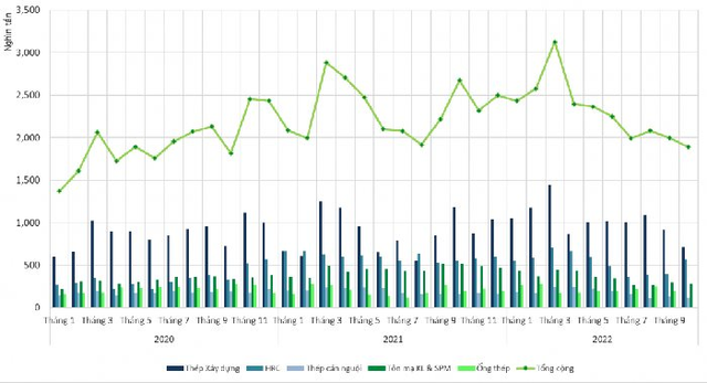 Theo báo cáo của Hiệp hội thép Việt Nam (VSA), trong tháng 10/2022, sản xuất thép thành phẩm đạt 2,046 triệu tấn, giảm 16,38% so với tháng trước và giảm 28,7% so với cùng kỳ 2021. Tiêu thụ thép các loại đạt 1,888 triệu tấn, giảm 5,53% so với tháng trước và giảm 29,4% so với cùng kỳ.