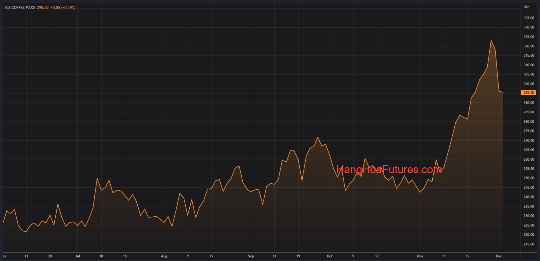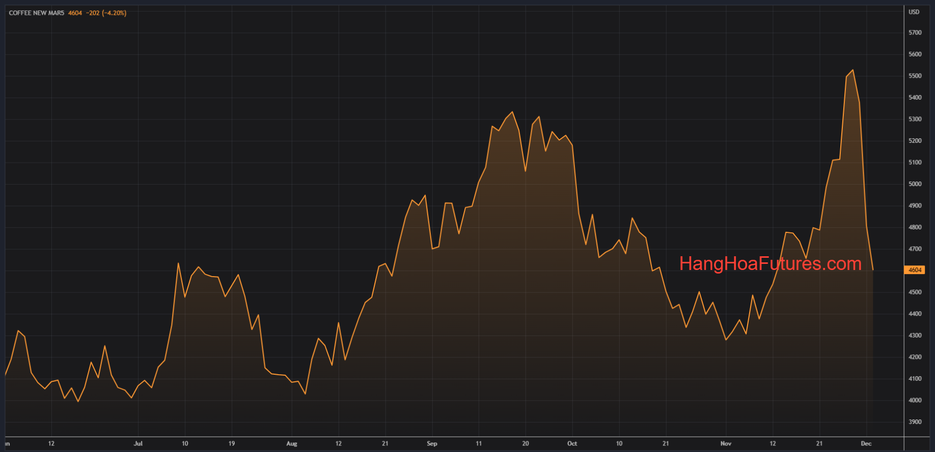 New York, ngày 3 tháng 12 năm 2024 – Giá cà phê Robusta giao tương lai trên sàn ICE tiếp tục lao dốc vào thứ Ba sau khi đạt mức giá cao nhất trong nhiều thập kỷ vào tuần trước, do các nhà giao dịch cho rằng có một làn sóng bán ra ồ ạt từ Việt Nam – quốc gia sản xuất cà phê hàng đầu.