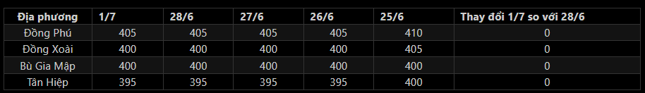 + Thị trường Mủ cao su ngày 1/7: Giá mủ nước thu mua tại Bình Phước tạm chững trong đầu tuần, dao động 395-405 đồng/độ. Trong khi giá mủ chén không đổi so với hôm trước, đạt mức 18.000-20.000 đồng/kg.
