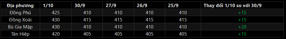 + Thị trường Mủ cao su ngày 1/10: Giá mủ nước thu mua tại Bình Phước tăng mạnh 15-20 đồng/độ so với hôm trước, dao động 420-430 đồng/độ. Người dân tích cực cạo mủ do các doanh nghiệp thu mua với giá cao. Trong khi giá mủ chén tăng 1.000 đồng/kg so với hôm trước, đạt mức 18.000-20.000 đồng/kg.