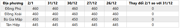 + Thị trường Mủ cao su ngày 2/1: Giá mủ nước thu mua tại Bình Phước không đổi so với hôm trước, dao động 445-460 đồng/độ. Trong khi đó, giá mủ chén tiếp tục đi ngang sau khi nghỉ tết Dương lịch, đạt mức 17.500-18.500 đồng/kg.