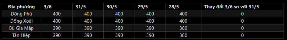 + Thị trường Mủ cao su ngày 3/6: Giá mủ nước thu mua tại Bình Phước giữ ổn định trong đầu tuần này, dao động 390-400 đồng/độ. Trong khi giá mủ chén tạm chững ở mức cao so với hôm trước, đạt mức 18.000-20.000 đồng/kg.