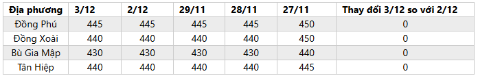 + Thị trường Mủ cao su ngày 3/12: Giá mủ nước thu mua tại Bình Phước giữ ổn định so với hôm trước, dao động 430-445 đồng/độ. Trong khi đó, giá mủ chén không đổi so với hôm trước, đạt mức 16.000-17.500 đồng/kg.