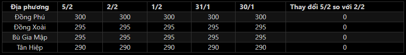 + Thị trường Mủ cao su ngày 5/2: Giá mủ nước thu mua tại Bình Phước không đổi trong đầu tuần này, dao động 290-300 đồng/độ. Người dân bắt đầu dừng cạo mủ, chuẩn bị nghỉ Tết Nguyên Đán. Trong khi giá mủ chén giữ ổn định so với hôm trước, đạt mức 12.500-13.500 đồng/kg.
