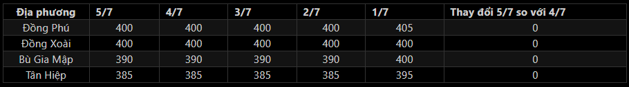 + Thị trường Mủ cao su ngày 5/7: Giá mủ nước thu mua tại Bình Phước giữ ổn định so với hôm trước, dao động 385-400 đồng/độ. Trong khi giá mủ chén không đổi so với hôm trước, đạt mức 18.000-19.000 đồng/kg.