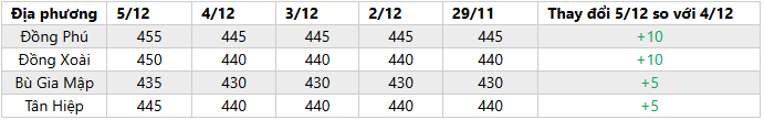 + Thị trường Mủ cao su ngày 5/12: Giá mủ nước thu mua tại Bình Phước tăng 5-10 đồng/độ so với hôm trước, dao động 430-445 đồng/độ. Lượng mủ thiếu hụt do thời tiết mưa nhiều. Trong khi đó, giá mủ chén tăng 500-1.000 đồng/kg so với hôm trước, đạt mức 17.000-18.000 đồng/kg.