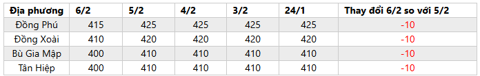 + Thị trường Mủ cao su ngày 6/2: Giá mủ nước thu mua tại Bình Phước giảm 10 đồng/độ so với hôm trước, dao động 400-415 đồng/độ. Trong khi đó, giá mủ chén không đổi so với hôm trước, đạt mức 16.000-17.500 đồng/kg.