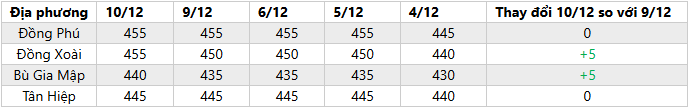 + Thị trường Mủ cao su ngày 10/12: Giá mủ nước thu mua tại Bình Phước tăng 5 đồng/độ so với hôm trước, dao động 440-455 đồng/độ. Trong khi đó, giá mủ chén tại 1 số địa phương tăng 500 đồng/kg so với hôm trước, đạt mức 17.000-18.000 đồng/kg.