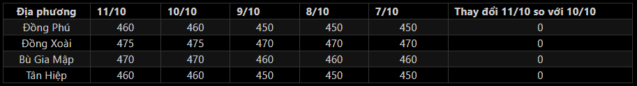 + Thị trường Mủ cao su ngày 11/10: Giá mủ nước thu mua tại Bình Phước không đổi so với hôm trước, dao động 460-475 đồng/độ. Trong khi giá mủ chén tạm chững ở mức cao so với hôm trước, đạt mức 19.000-21.000 đồng/kg.