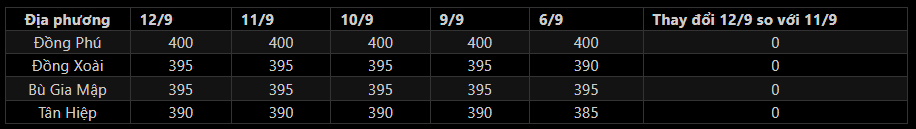 + Thị trường Mủ cao su ngày 12/9: Giá mủ nước thu mua tại Bình Phước giữ ổn định so với hôm trước, dao động 390-400 đồng/độ. Trong khi giá mủ chén tăng nhẹ 500 đồng/kg so với hôm trước, đạt mức 18.000-19.500 đồng/kg.