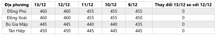 + Thị trường Mủ cao su ngày 13/12: Giá mủ nước thu mua tại Bình Phước không đổi so với hôm trước, dao động 445-460 đồng/độ. Trong khi đó, giá mủ chén giữ ổn định so với hôm trước, đạt mức 17.500-18.500 đồng/kg.