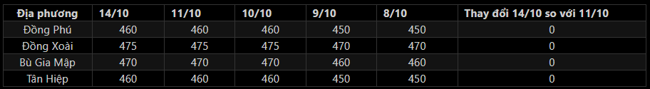 + Thị trường Mủ cao su ngày 14/10: Giá mủ nước thu mua tại Bình Phước tiếp tục không đổi so với hôm trước, dao động 460-475 đồng/độ. Trong khi giá mủ chén giữ ổn định trong đầu tuần này, đạt mức 19.000-21.000 đồng/kg.