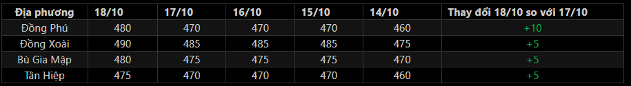 + Thị trường Mủ cao su ngày 18/10: Giá mủ nước thu mua tại Bình Phước tăng 5-10 đồng/độ so với hôm trước, dao động 475-490 đồng/độ. Trong khi giá mủ chén không đổi trong suốt tuần này đạt mức 19.000-21.000 đồng/kg.