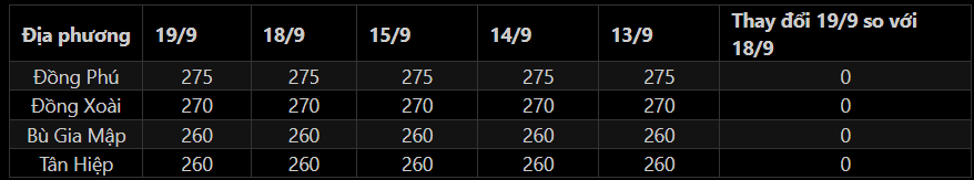+ Thị trường Mủ cao su ngày 19/9: Giá mủ cao su thu mua tại Bình Phước không đổi trong đầu tuần này. Giá mủ nước dao động 260-275 đồng/độ. Trong khi giá mủ chén duy trì ở mức 11.500-13.000 đồng/kg.