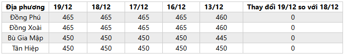 + Thị trường Mủ cao su ngày 19/12: Giá mủ nước thu mua tại Bình Phước không đổi ngày thứ 3 liên tiếp so với hôm trước, dao động 450-465 đồng/độ. Thời tiết mưa nhiều và lạnh khiến nông dân ít cạo mủ, lượng mủ cũng thấp. Trong khi đó, giá mủ chén giữ ổn định so với hôm trước, đạt mức 18.000-19.000 đồng/kg.