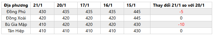 + Thị trường Mủ cao su ngày 21/1: Giá mủ nước thu mua tại Bình Phước giảm 5-10 đồng/độ, dao động 410-430 đồng/độ. Người dân ít cạo mủ, chuẩn bị nghỉ Tết Nguyên Đán. Trong khi đó, giá mủ chén giữ ổn định so với hôm trước, đạt mức 16.000-18.000 đồng/kg.