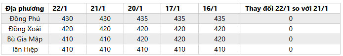 + Thị trường Mủ cao su ngày 22/1: Giá mủ nước thu mua tại Bình Phước không đổi, dao động 410-430 đồng/độ. Trong khi đó, giá mủ chén tiếp tục giữ ổn định so với hôm trước, đạt mức 16.000-18.000 đồng/kg.