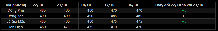 + Thị trường Mủ cao su ngày 22/10: Giá mủ nước thu mua tại Bình Phước tăng 5 đồng/độ so với hôm trước, dao động 480-490 đồng/độ. Trong khi giá mủ chén tiếp tục tạm chững so với hôm trước, đạt mức 19.000-21.000 đồng/kg.