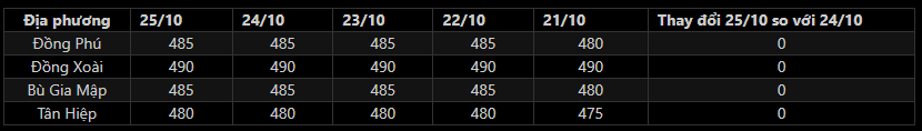 + Thị trường Mủ cao su ngày 25/10: Giá mủ nước thu mua tại Bình Phước tạm chững ở mức cao so với hôm trước, dao động 480-490 đồng/độ. Trong khi giá mủ chén tiếp tục không đổi so với hôm trước, đạt mức 19.000-21.000 đồng/kg.